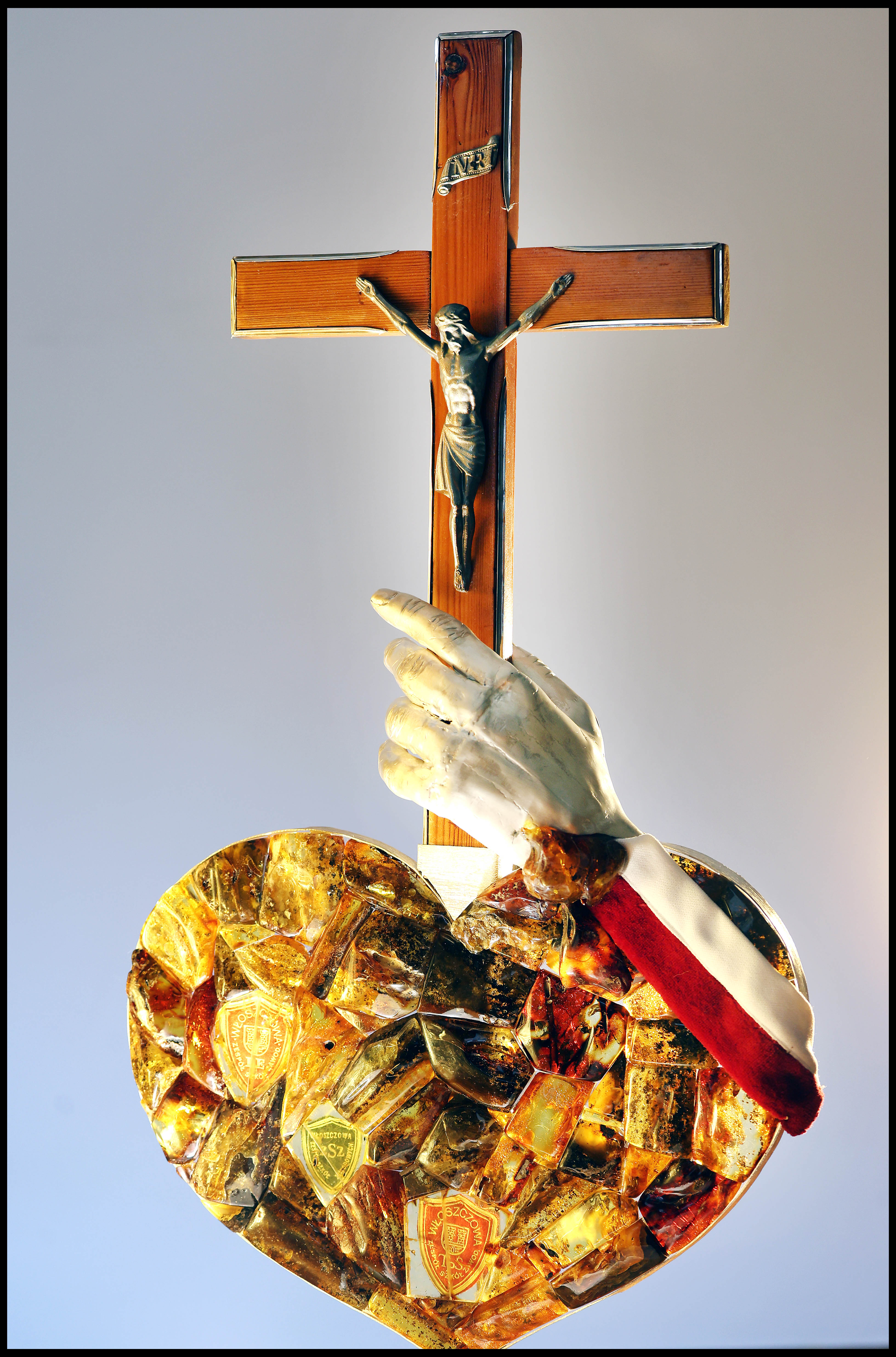 Bursztynowe serce nawiązuje do serca uszytego, przez młodzież, która stanęła w obronie krzyży usuwanych ze szkół w 1984 r. Zwykły drewniany krzyż to ich dar, dla księdza dającego im wtedy wsparcie, zwłaszcza to duchowe.